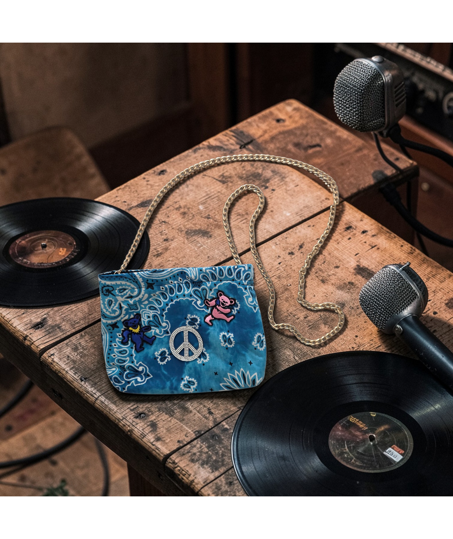 This one-of-a-kind blue bandana bag brings vintage music-market energy with a playful crystal-free statement look and an easy chain strap for grab-and-go styling. The peace symbol and dancing bear-style patches give it a fun retro vibe, while the compact shape makes it perfect for day trips, concerts, and casual nights out. Estimated Size: Small crossbody / mini shoulder bag. This item is handmade and individually finished, so slight variations in placement, stitching, and overall appearance may occur.