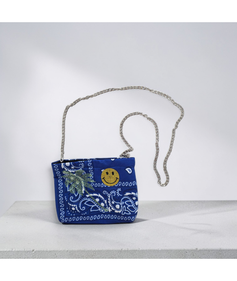 Bright, playful, and easy to style, this blue bandana mini bag brings a fun laid-back vibe with a smiley-style patch, palm tree accent, and sleek chain strap. It works as a casual statement piece that feels youthful, collectible, and totally one-of-a-kind. Estimated Size: Small crossbody / mini shoulder bag. This handmade item is individually finished, so slight differences in patch placement, trim, and stitching may occur and are part of the design.
