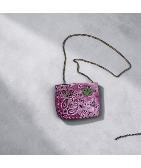 Handmade pink bandana mini bag with smiley patch and chain strap. Only 1 available.