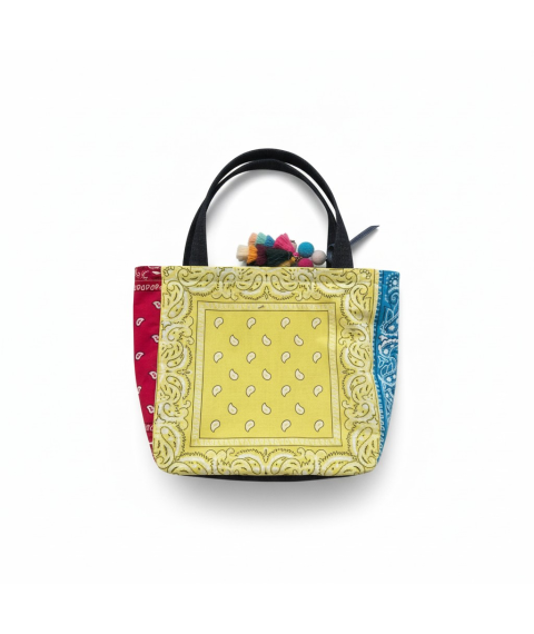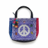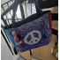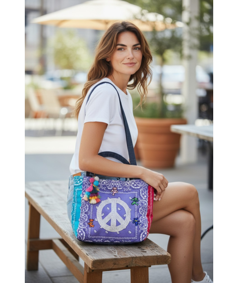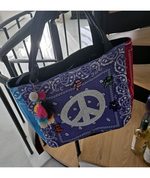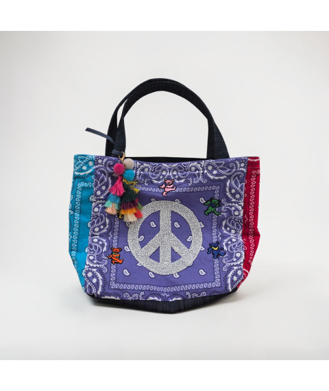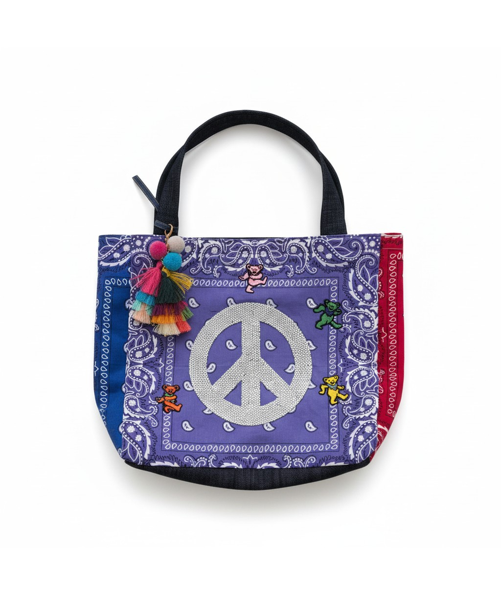 This one-of-a-kind tote bag blends retro color, peace-sign energy, and boutique handmade style into a standout accessory that instantly gets noticed. The front features a bold crystal peace symbol set against purple bandana fabric, framed with contrasting blue and red side panels, playful bear accents, and a multicolor tassel charm for extra personality. It is roomy enough for daily essentials while still feeling collectible, wearable, and fun. Estimated Size: Medium tote / shoulder bag. This piece is handmade and individually finished, so slight variations in stitching, trim placement, fabric pattern, and embellishment detail may occur and are part of its unique character.