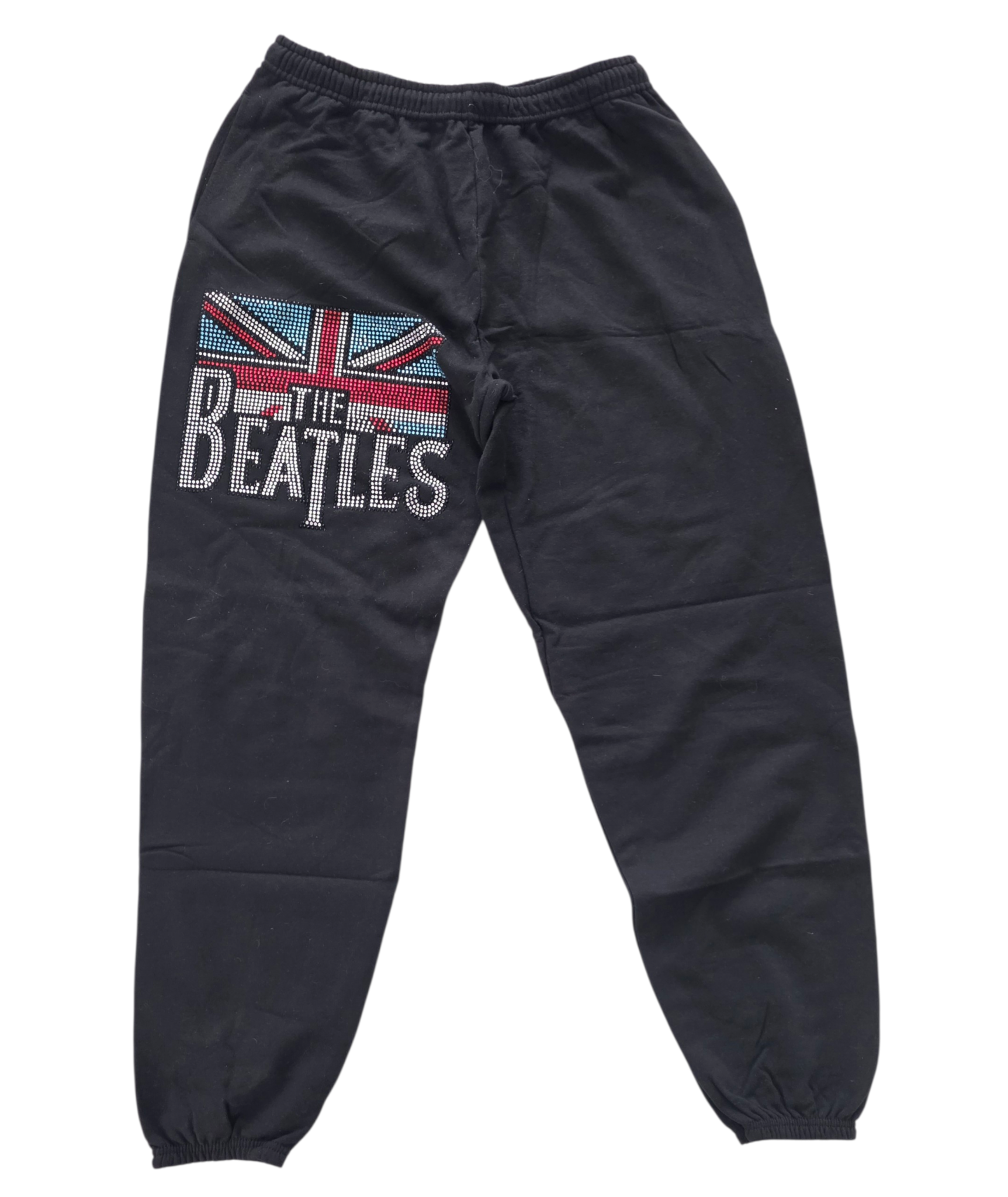 These handmade black joggers bring iconic music energy into modern streetwear with a crystal-studded Beatles-inspired graphic. Designed for comfort with an elastic waist and relaxed fit, they’re perfect for everyday wear with a bold twist. Estimated Size: Women’s Large relaxed fit. Each piece is individually finished, so slight variations in design and crystal placement may occur, ensuring no two pairs are exactly alike.