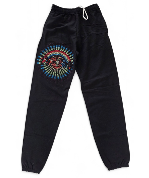 These black joggers feature a vibrant rainbow burst crystal design that adds energy and movement to a classic silhouette. Designed with a relaxed fit and elastic waistband, they deliver both comfort and standout style. Estimated Size: Women’s Large relaxed fit. Each piece is handmade, so crystal placement and color variation may slightly differ, ensuring uniqueness.