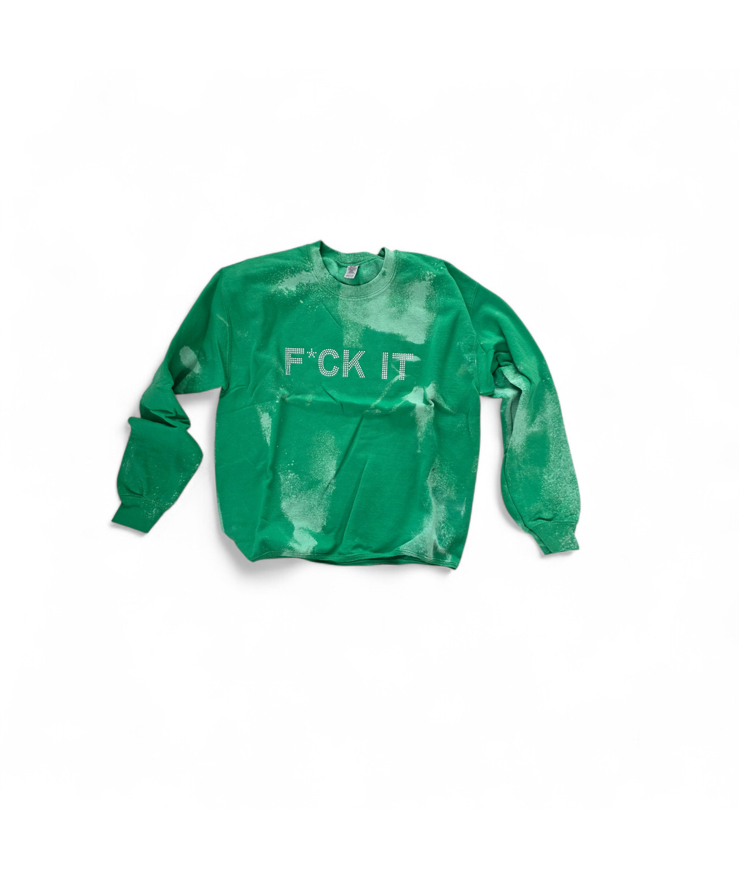 This green washed sweatshirt features a bold crystal text design for a strong, unapologetic statement. The distressed wash adds edge while maintaining a luxury boutique finish. Estimated Size: Women’s Large relaxed fit.