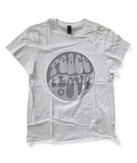 This white t-shirt features a large crystal peace and love design inspired by retro aesthetics. Soft and breathable with a relaxed fit, it’s ideal for everyday wear. Estimated Size: Women’s Large relaxed fit. Handmade construction ensures slight variation in crystal placement.