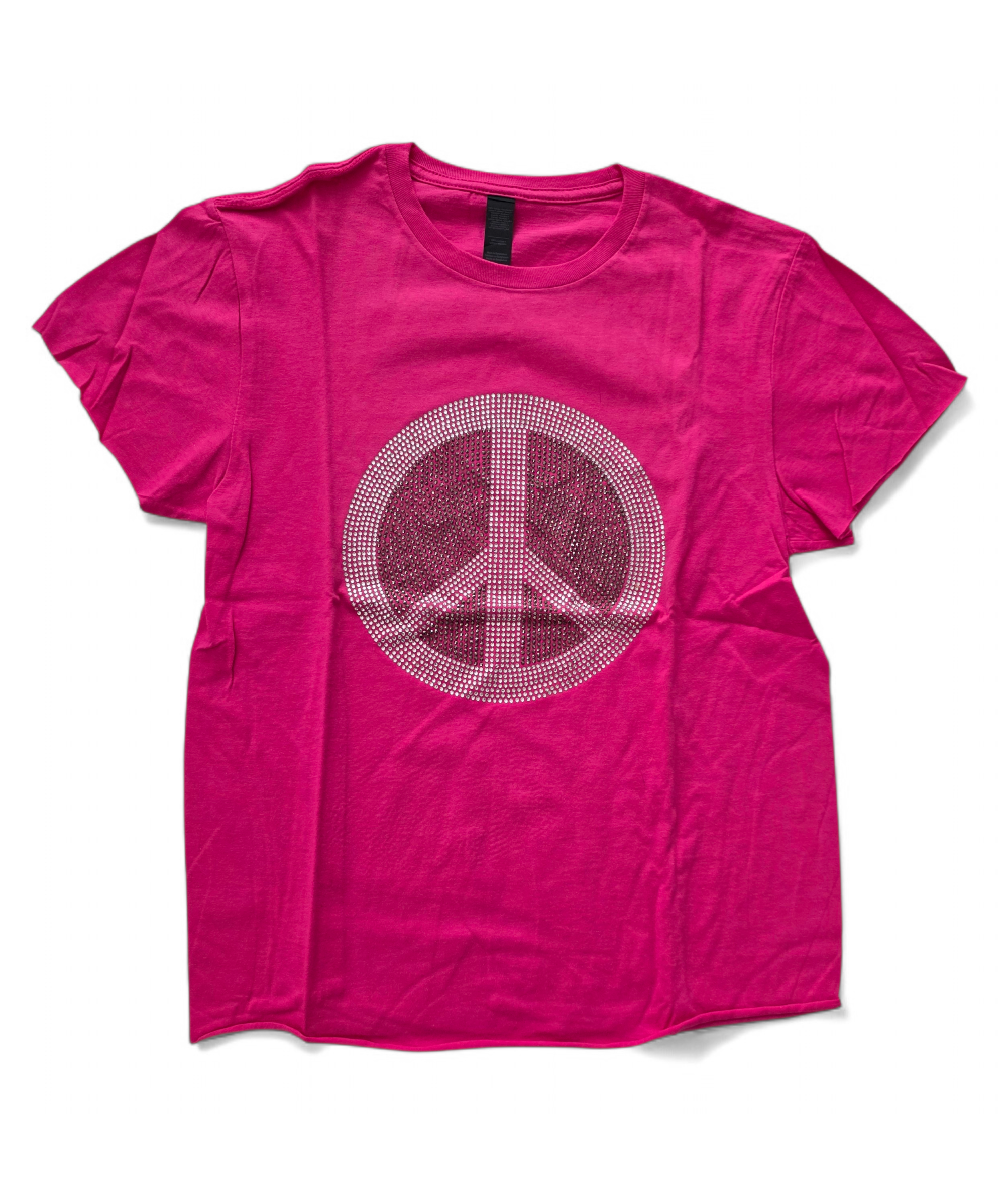 This bold pink t-shirt features a large crystal peace symbol, combining vibrant color with a timeless message. Lightweight and comfortable, it’s perfect for casual wear or styled looks. Estimated Size: Women’s Large relaxed fit. Handmade detailing ensures each piece is unique.