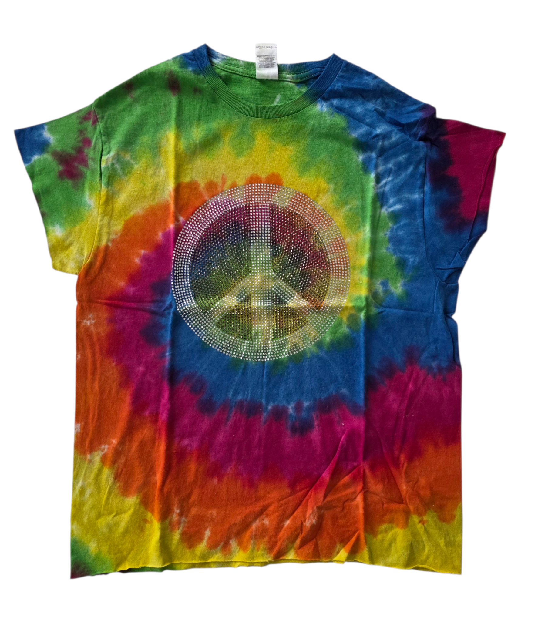 This handmade tie-dye tee brings color, energy, and sparkle together with a bold crystal peace symbol front and center. The vibrant dye pattern ensures no two pieces are alike, while the relaxed fit makes it easy to wear anywhere. Estimated Size: Women’s Large relaxed fit. Due to the handmade dye process, color patterns and crystal placement may vary slightly, adding to its unique character.
