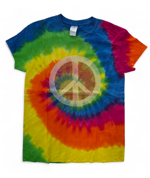 This tie dye t-shirt features a vibrant multi-color pattern paired with a large crystal peace symbol. Each piece is completely unique due to the dye process, making it a true one-of-a-kind item. Comfortable, bold, and perfect for festival or casual wear. Estimated Size: Women’s Large relaxed fit.