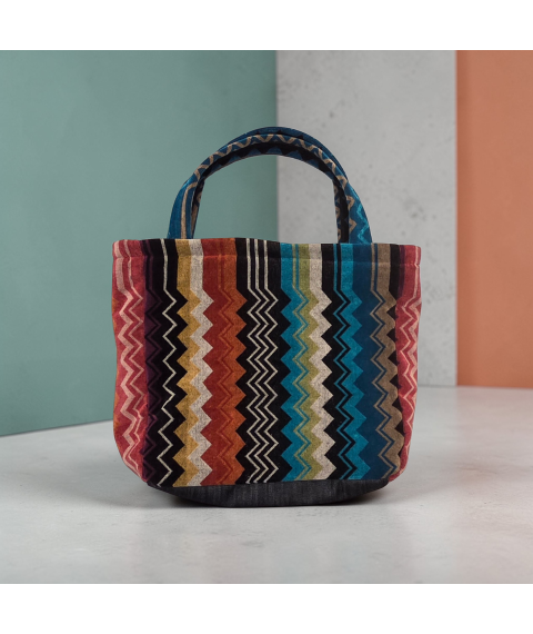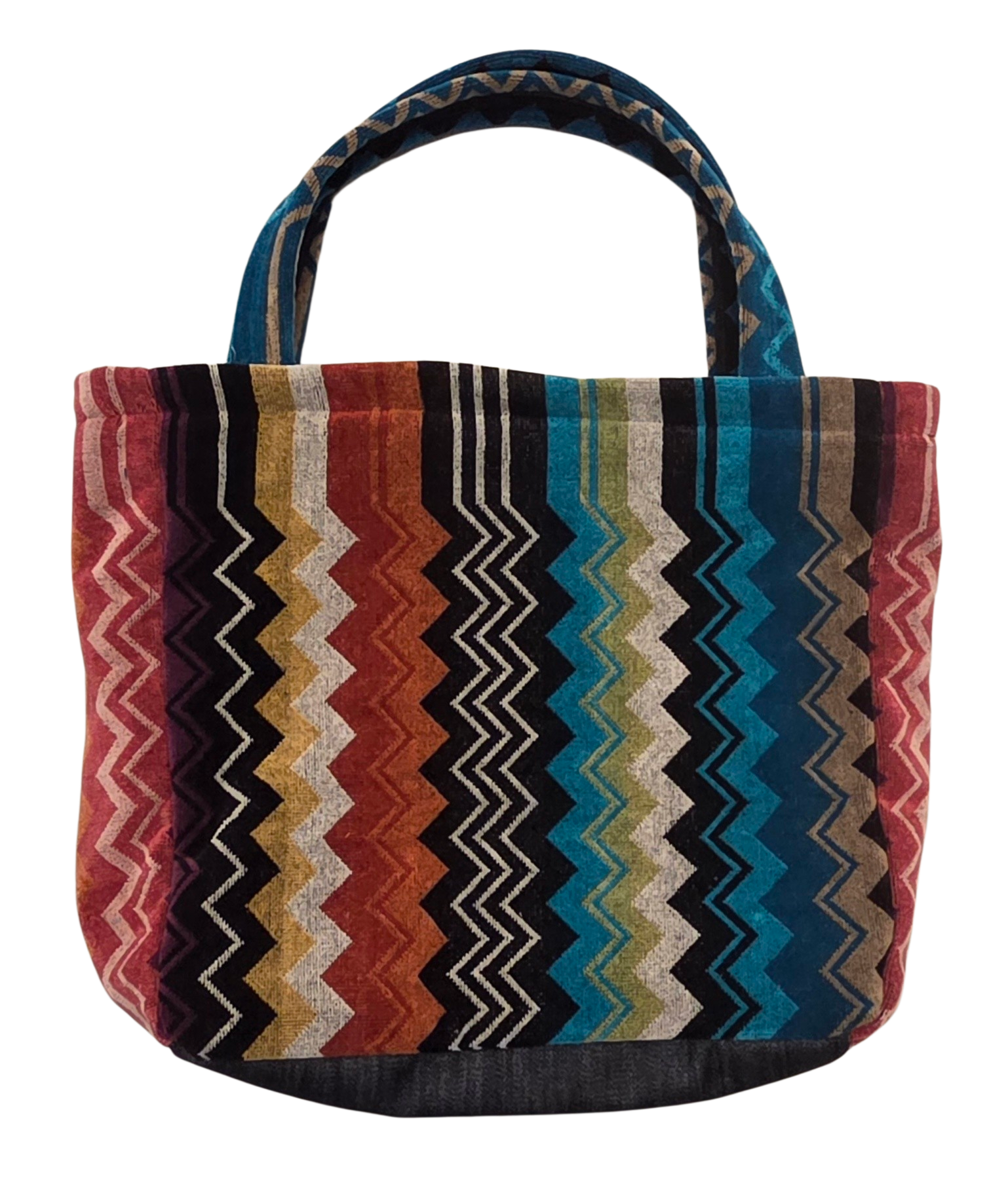 Add color and character to your look with this upcycled multicolor zigzag tote bag, designed for those who love bold, expressive fashion.