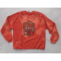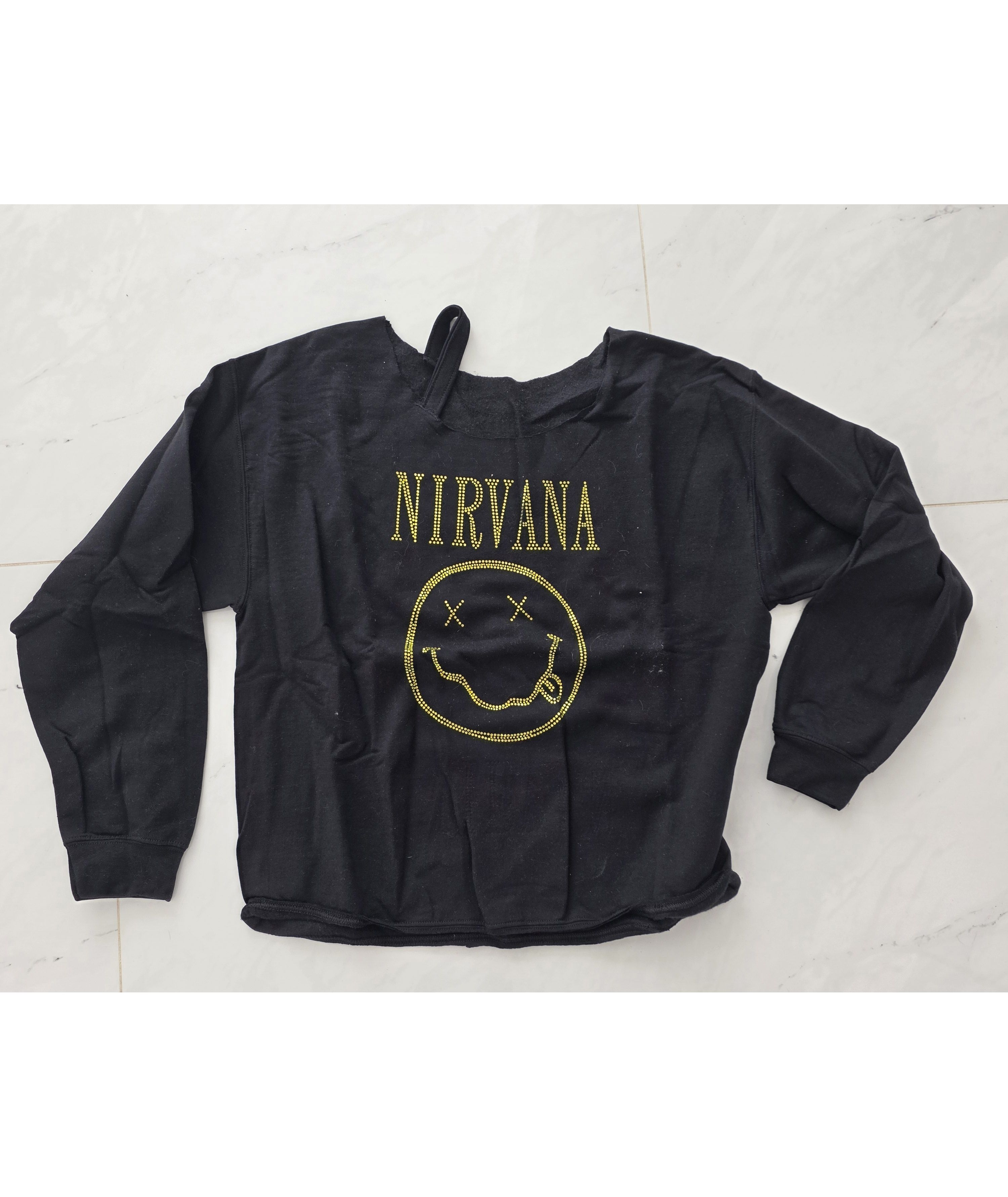 Make a statement with this upcycled black sweatshirt featuring a bold rhinestone smiley-inspired graphic. Designed with a relaxed fit and distressed vintage wash, this piece blends music-inspired street style with elevated detailing. Each sweatshirt is uniquely treated, making every piece one-of-a-kind.