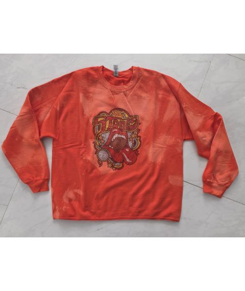 Orange upcycled sweatshirt with tongue-inspired graphic and rhinestone detail.
